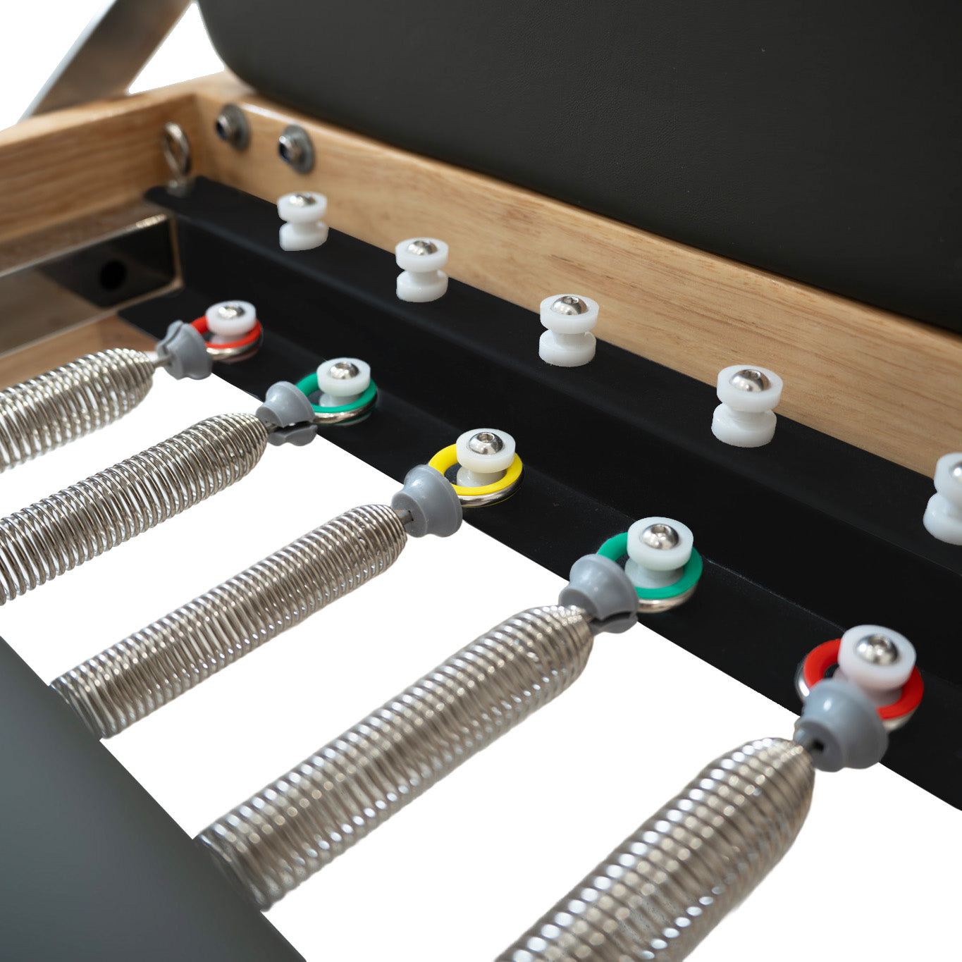 Five colour-coded steel springs offer various levels of resistance, catering to all ability levels and giving users full control over workout intensity. The spring system is easily adjustable by simply hooking or unhooking springs, making transitions between exercises smooth and effortless. Height-adjustable cable pulleys and a foot bar further enhance customisation, allowing for more precise alignment and control during movement.