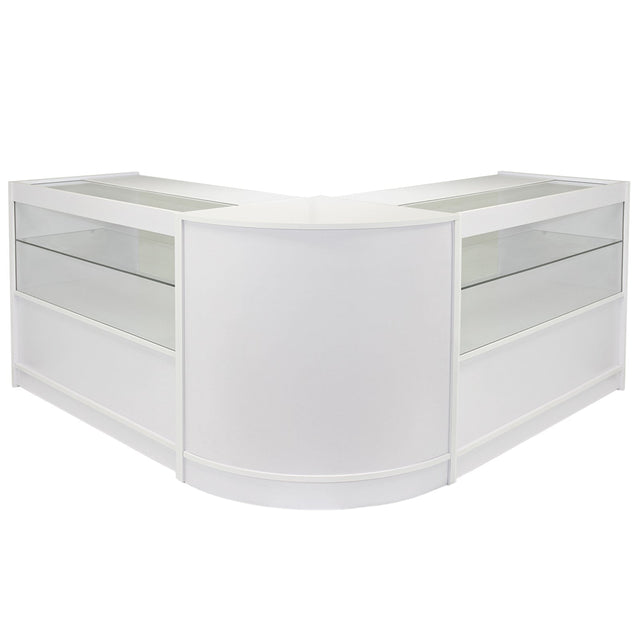 The closed CM60 counter is a curved retail display unit with storage shelves to the rear. The unit is designed to connect any combination of the A1200, B1200, C1200 or K1200 counters together to create a large L shaped counter set but can also be used as a standalone unit.