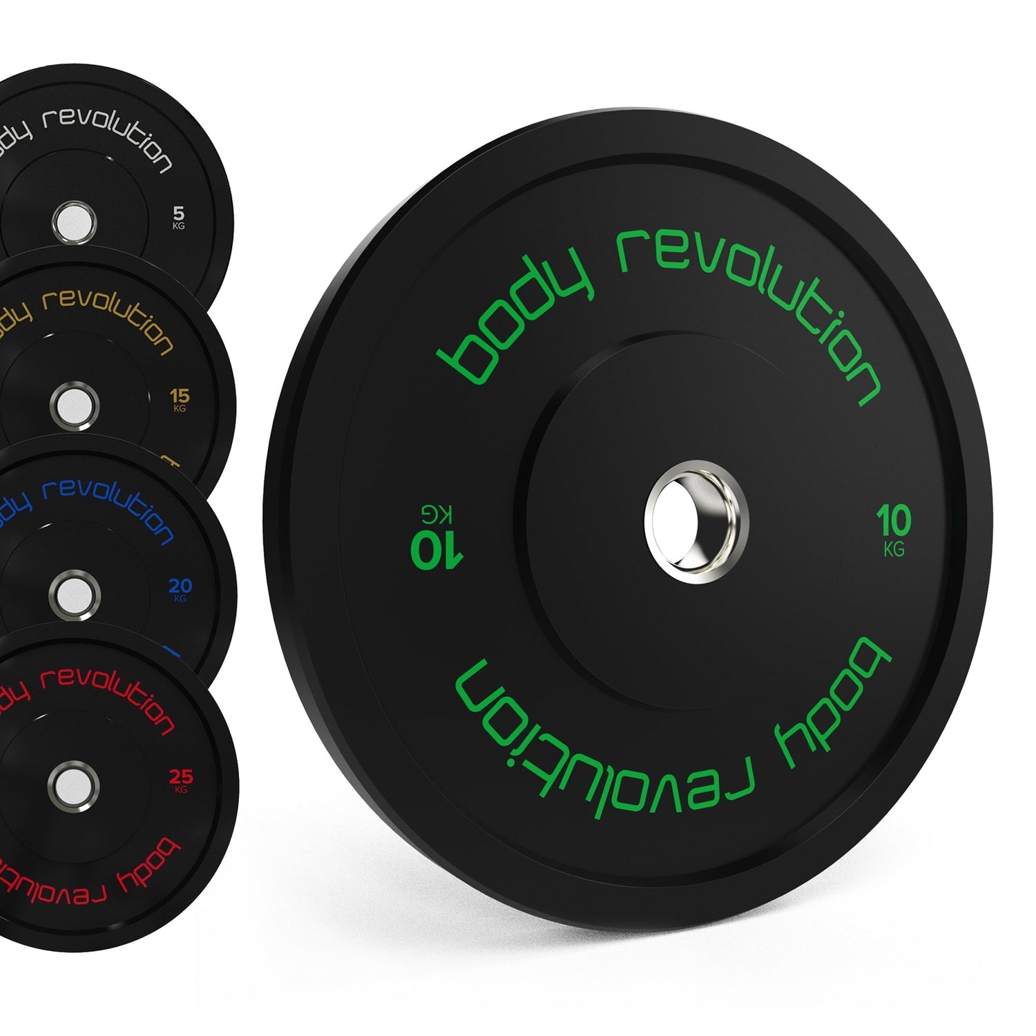 Body Revolution's Olympic Rubber-Coated Weight Plates are designed to enhance your fitness journey, whether you're focusing on strength training or endurance. Available as singles or pairs, these weight plates are constructed from solid cast iron and coated with heavy-duty rubber to withstand frequent, intense usage. The durable rubber coating minimizes damage to your equipment, floors, and yourself, making them ideal for both home and gym environments.