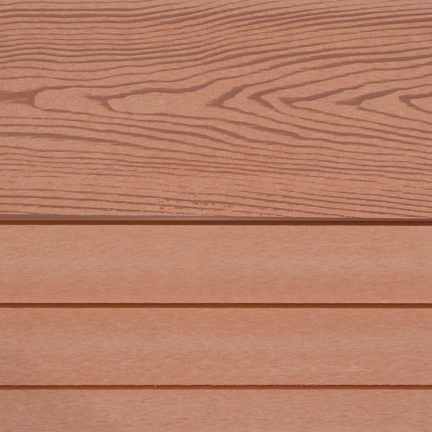 What sets this composite fencing apart is its versatile double-sided design: one side showcases a solid wood grain effect, while the reverse features a modern, slatted finish. Both sides of the panels boast a sophisticated brown finish, capturing the beauty of timber without the need for regular upkeep.