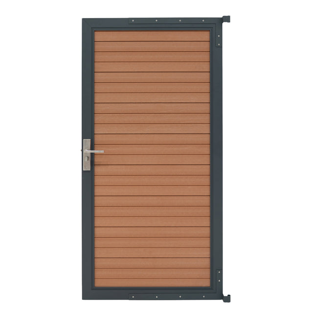 Expertly crafted from premium WPC (wood-plastic composite) and reinforced with a sturdy aluminium frame, the gate combines aesthetic appeal with structural strength. Its composition includes nine interlocking slats, forming one solid, reliable gate panel that maintains its integrity and appearance over time. The aluminium frame not only adds strength but also features a versatile attachment, designed to allow easy installation onto a range of posts or existing structures using the pre-drilled fixing points.